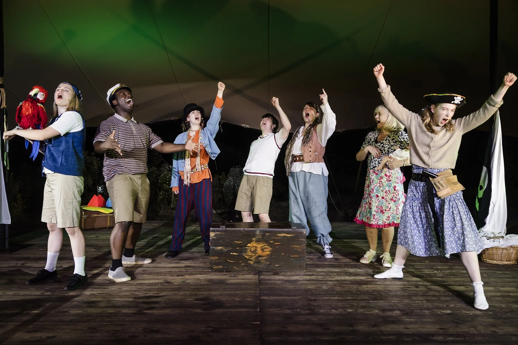 Treasure Island was our first Christmas touring show. Performed in the round, with audience on all sides, we transformed village halls and schools into an inn, a boat and an island using only sheets, lamps and voices. Full of hilarious pirates, some musical loop pedal magic and of course, pointy hats, this show was a real knees up m’hearties!